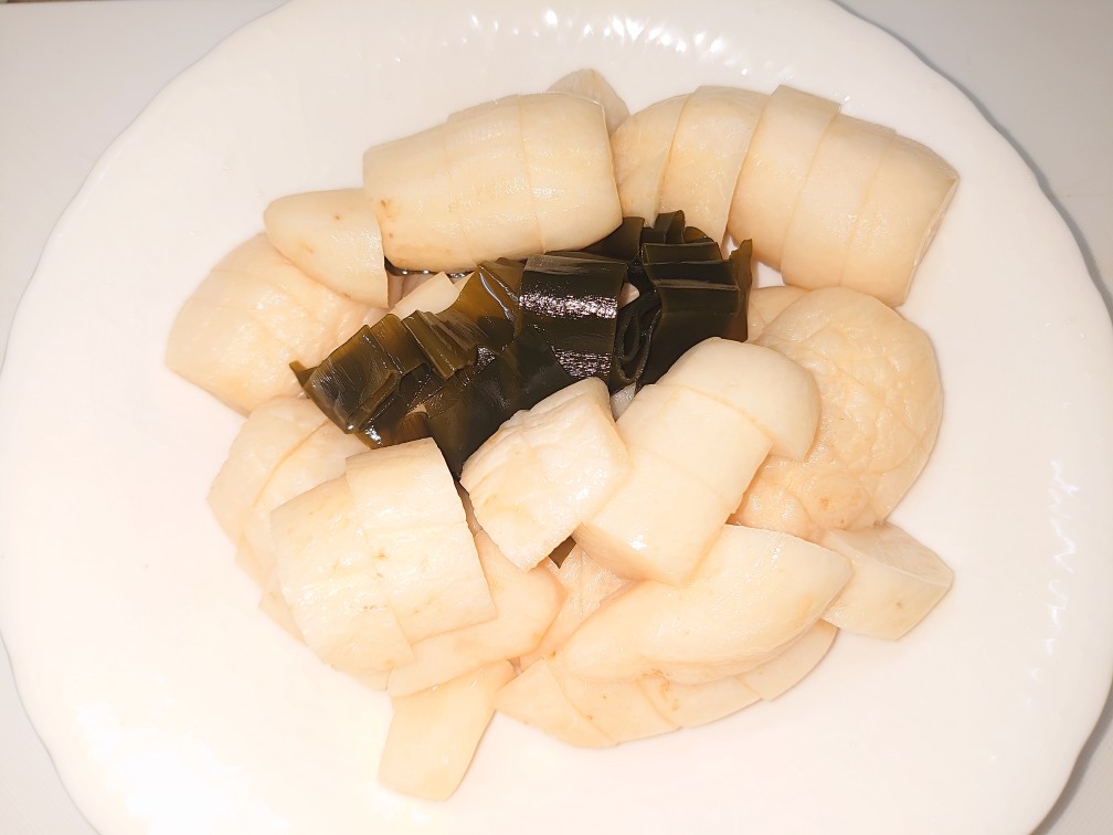 先輩の取り皿に3切れ、「うちで育てた大根で作ったんですよ~」と強制的に盛り付けw