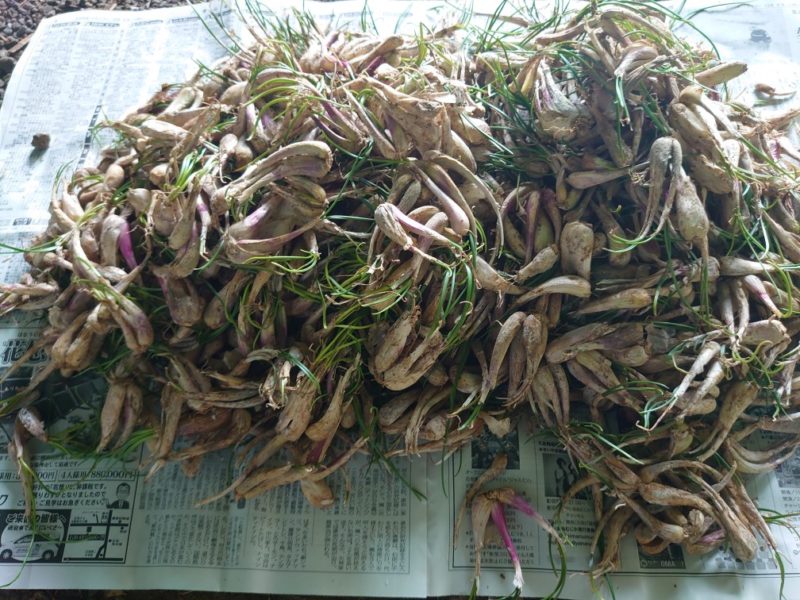 島らっきょう種球 カビが生えた表皮を取り除く作業をしましょー