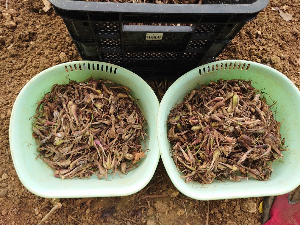 乾燥台を作って畑で乾燥させていた島らっきょうの種球ですが