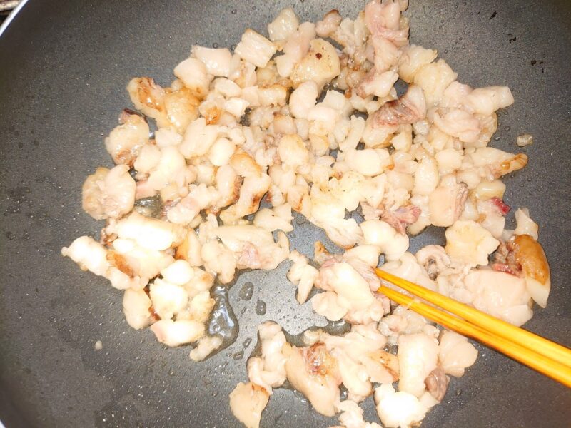 「昔、家で作っていたときは、肉の脂身をカリッカリになるまで炒めて、そこに味噌を入れて作ていた。」「この間の油味噌の肉は赤身が多かった。」「こんな肉じゃないとだめだ。」